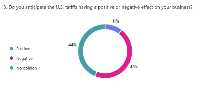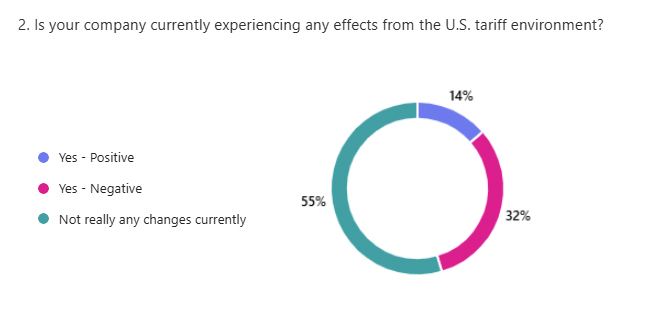 From the questions and follow up comments, the current tariff situation is not having a significant effect. However, for those that are experiencing an effect it is mostly negative. Additionally, an even smaller number (11%) of survey responders anticipate any positive effects in the future.