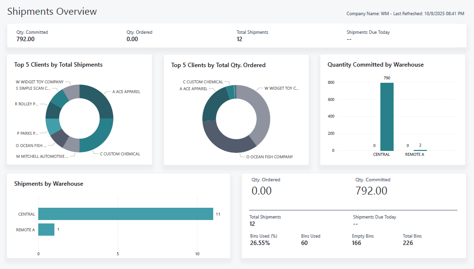 Excalibur Shipments ![]() Click to view example report | Outbound fulfillment dashboard. Provides end-to-end visibility on all outgoing orders/shipments. Tracks open orders and their committed inventory, shipments due today, and overall shipping volume by warehouse or client. Indicates which orders are ready to ship versus those awaiting stock or other tasks. Also shows shipment line details and workflow status | – Better Fulfillment Planning: Knowing what’s scheduled to ship (and from where) allows supervisors to allocate picking/packing resources optimally each day, improving throughput. – On-Time Delivery: By highlighting shipments due today or urgent orders, the team can prioritize critical fulfillments thereby boosting on-time shipment rates and customer satisfaction. – Bottleneck Prevention: Trends in outbound volume by client or warehouse help identify potential bottlenecks. |
